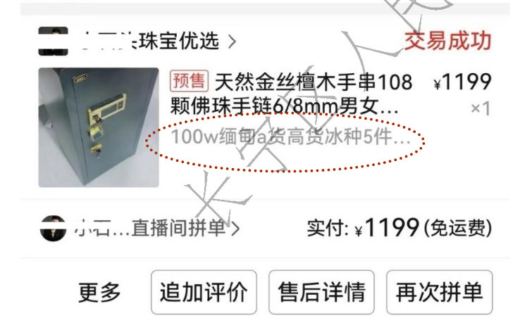 2. 订单快照显示(↓图2):100w缅甸A高货冰种5件—¥1199.