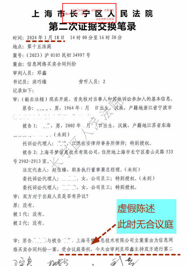 三、第二次证据交换时间:2024年1月18日。 【证据3】《证据交换笔录2》:2024年1月18日。 《笔录2》第1-2页,审(邓鑫):……,受合议庭委托,今天由审判员邓鑫主持双方进行第二次证据交换,……此时依然没有合议庭,合议庭也不可能委托。邓鑫法官无审判长祁晓栋授权私自办案,违法。